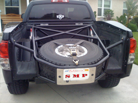 SMP-fabworks offers custom Bed Cages, bed cages are 100% custom to the pretence ofthe customer. They can be made completely bolt-on or weld-on. Cages can include multiple spare tire mounts and be made to still have room in the bed for motorcycles or other hauled objects. Bed Cages include shock mounts to gain more suspension travel with a longer shock. Call for details on pricing and material options.